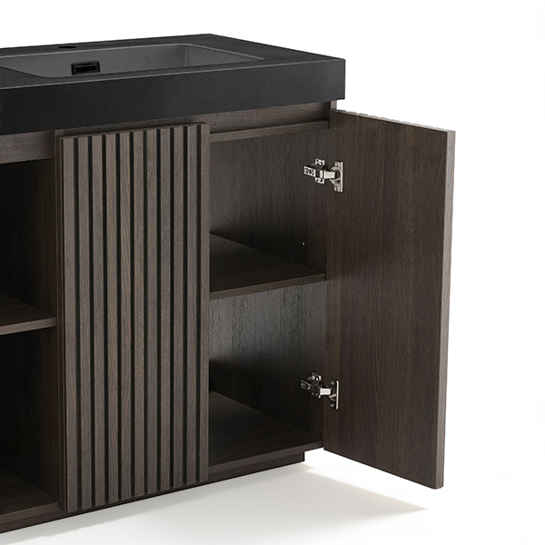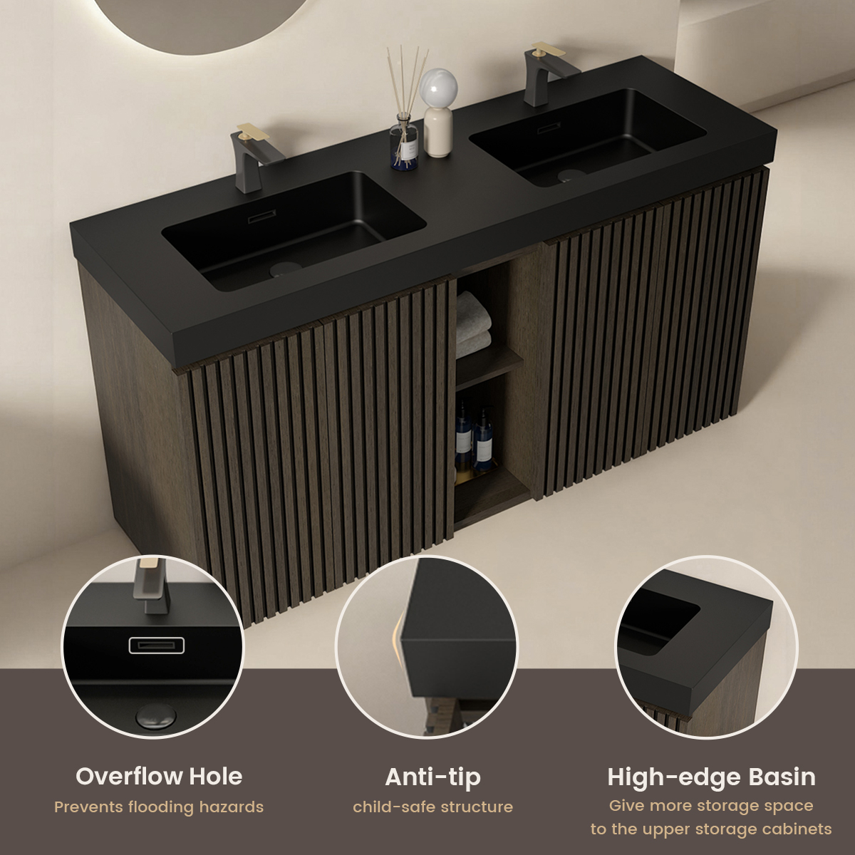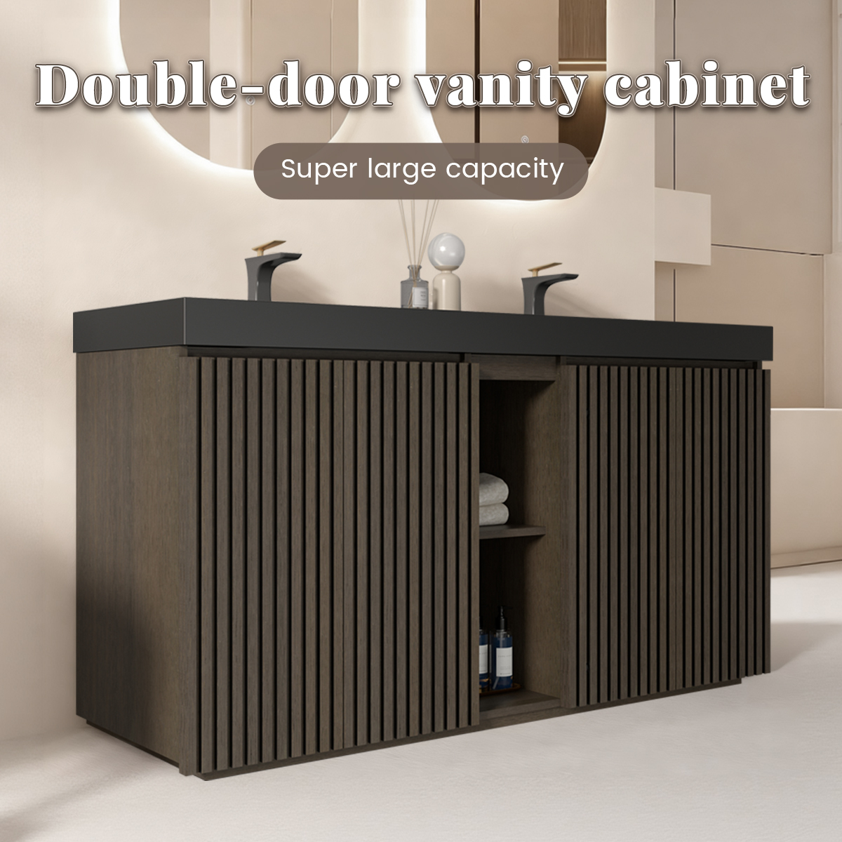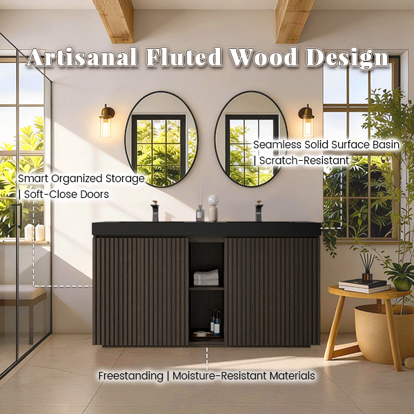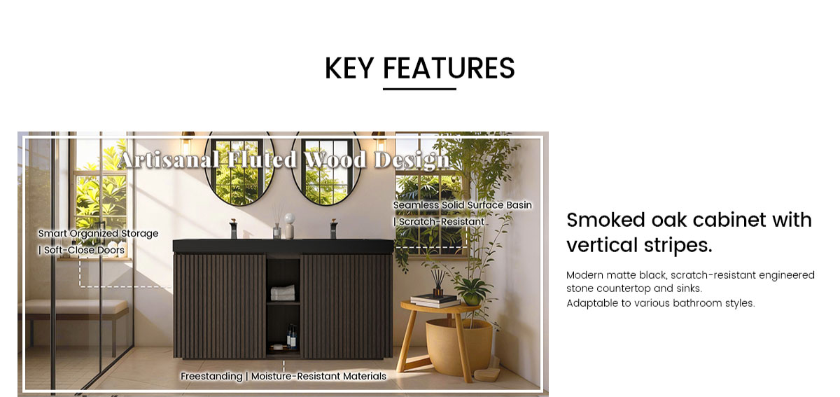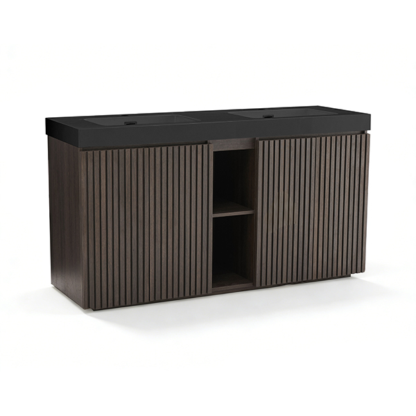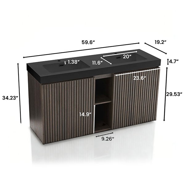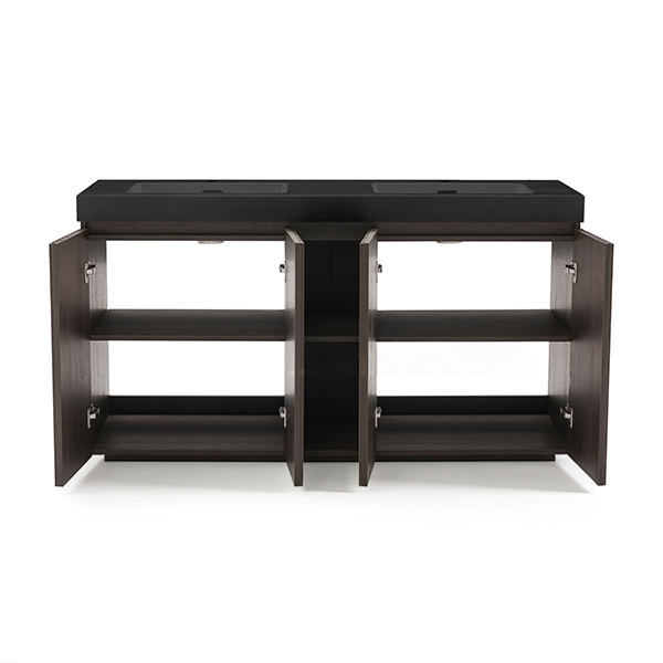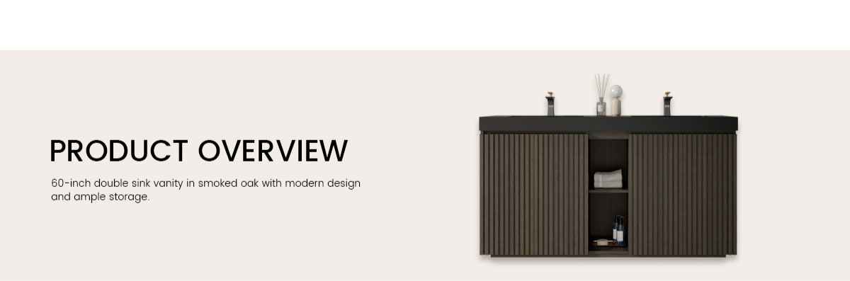 60-inch double sink vanity in smoked oak with modern design and ample storage.