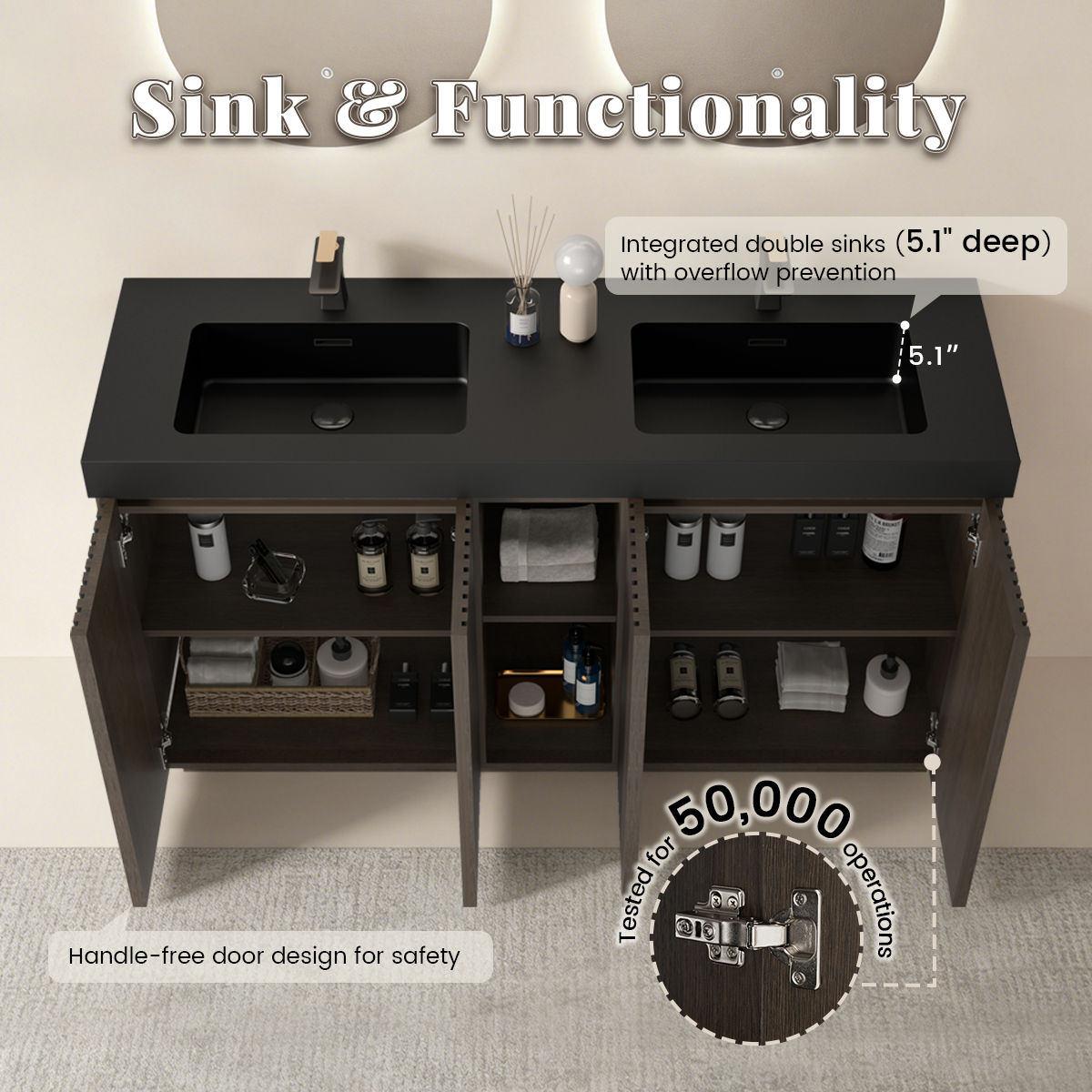 Integrated double sinks (5.1″ deep) with overflow prevention.